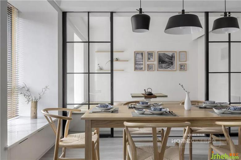 餐廳和書房整體相通,呈現(xiàn)出完全開放式的格局,充分利用黑框門,將兩個空間劃分,視覺空間更加開闊。長輩在茶室聊天喝茶、小孩在客廳嬉笑玩耍、大人在島臺忙碌備餐的情形一覽無余,沒有了墻體的分隔,整體空間大氣而流暢。