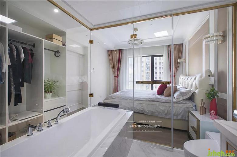 透明的主衛(wèi)生間可以擴(kuò)大空間視覺感,白色和金色的搭配讓空間清爽精致,讓整個主臥既時尚又滿足使用功能
