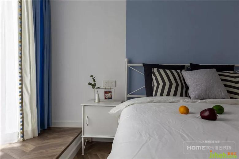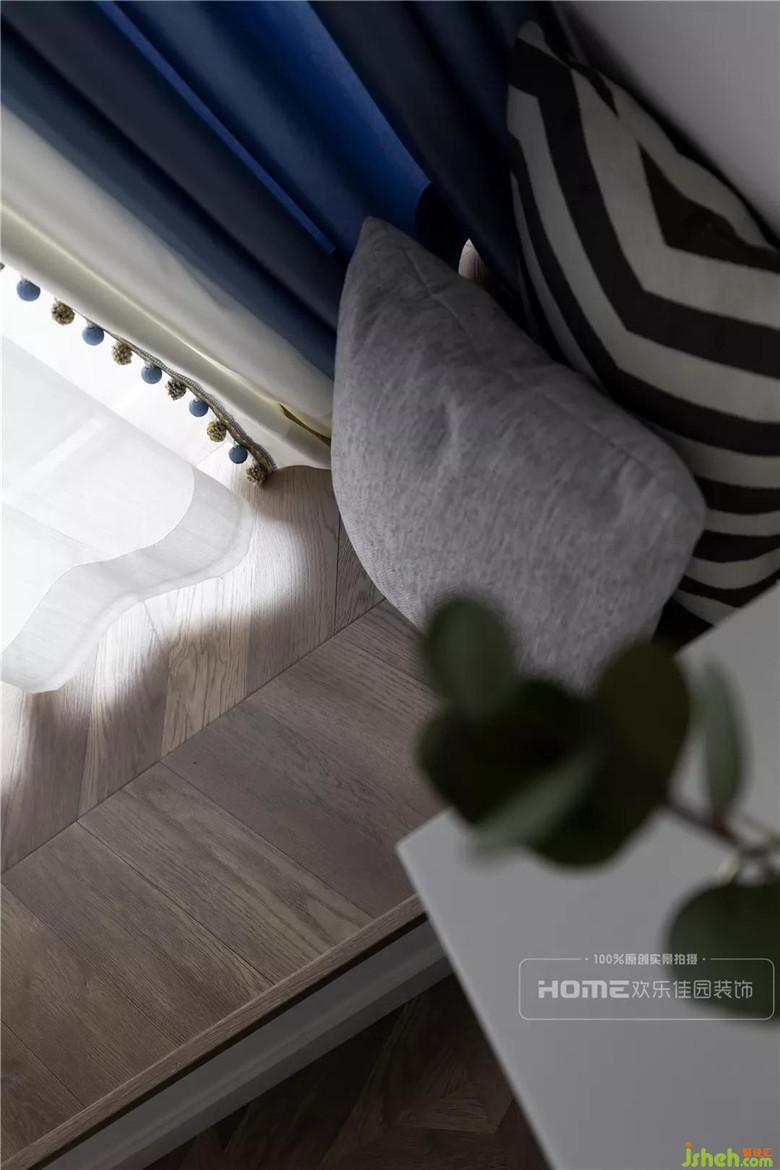 次臥有設(shè)計(jì)感的墻面分色,制造視覺焦點(diǎn),一邊藍(lán)、一邊白,靈動(dòng)又自然,不規(guī)則、不對(duì)稱,方能表達(dá)出不刻意的隨性;魚骨拼矮飄窗,貫穿整個(gè)家居空間,在第一縷暖陽(yáng)中睜開惺忪的睡眼,流動(dòng)的線條引領(lǐng)著美好的開端。