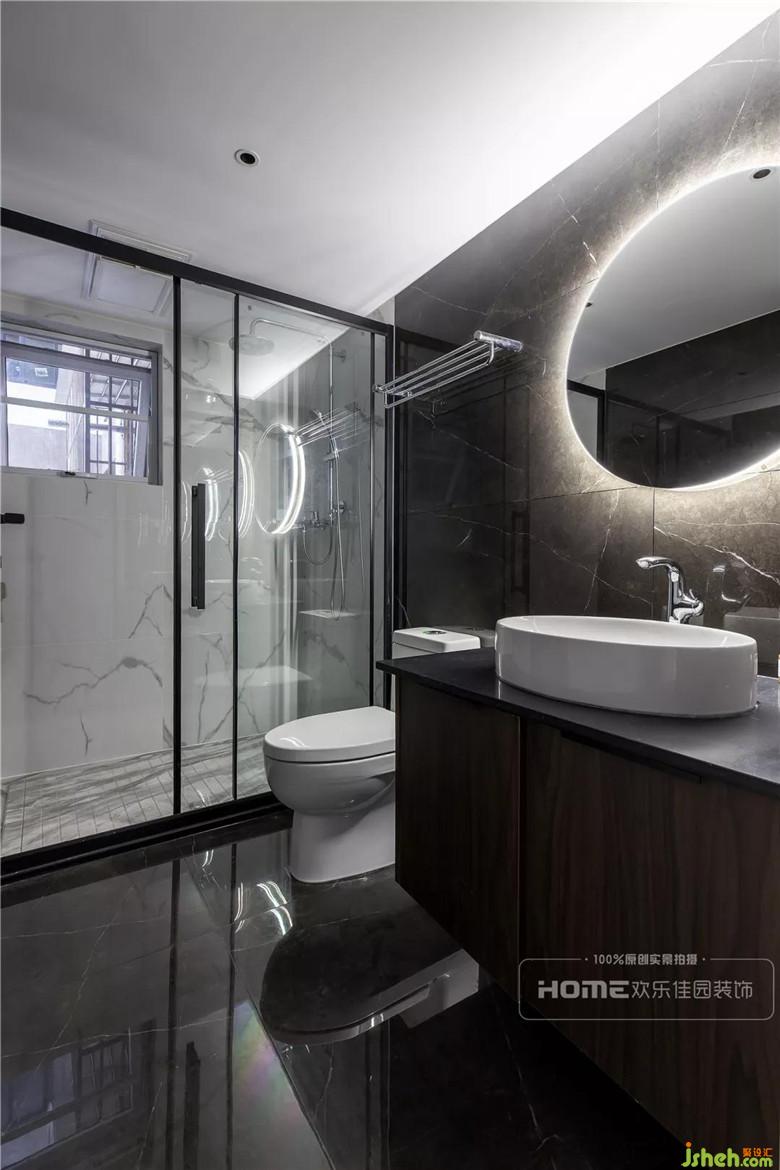 主衛(wèi)生間淋浴區(qū)與洗漱區(qū)用深淺色彩劃分,洗漱區(qū)深色墻地磚結(jié)合黑色大理石臺(tái)面,時(shí)尚簡(jiǎn)約中流露出個(gè)性與獨(dú)特。