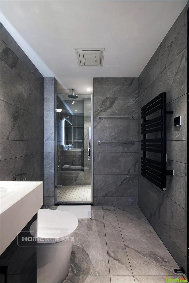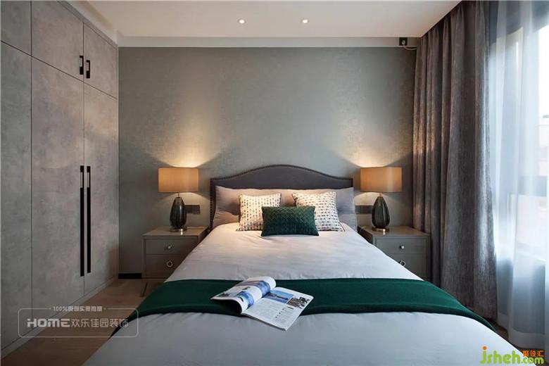 主臥室的設(shè)計(jì)非常出彩,從空間的結(jié)構(gòu)到材質(zhì)的顏色,處理都非常大膽,一面墨藍(lán)色墻布與現(xiàn)代輕奢的家具形成較大的反差;銅質(zhì)的線(xiàn)條、吊燈與暖灰色的墻板對(duì)比,呈現(xiàn)極佳的視覺(jué)沖擊。一縷溫暖的陽(yáng)光穿透大大的落地窗射入主臥室,頓時(shí)讓冷色裝點(diǎn)的室內(nèi)溫馨倍增。