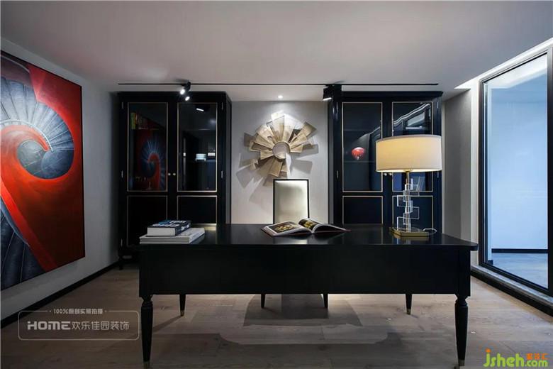 書(shū)房都是大面的處理,白色涂料的細(xì)膩與淺灰色墻紙的粗糙,有對(duì)比,有融合。黑色的家具在點(diǎn)光源的照射下更顯高級(jí)。業(yè)主親筆的巨型畫(huà)作,讓書(shū)房嚴(yán)肅的空間氛圍,頓時(shí)熱烈了起來(lái)。
