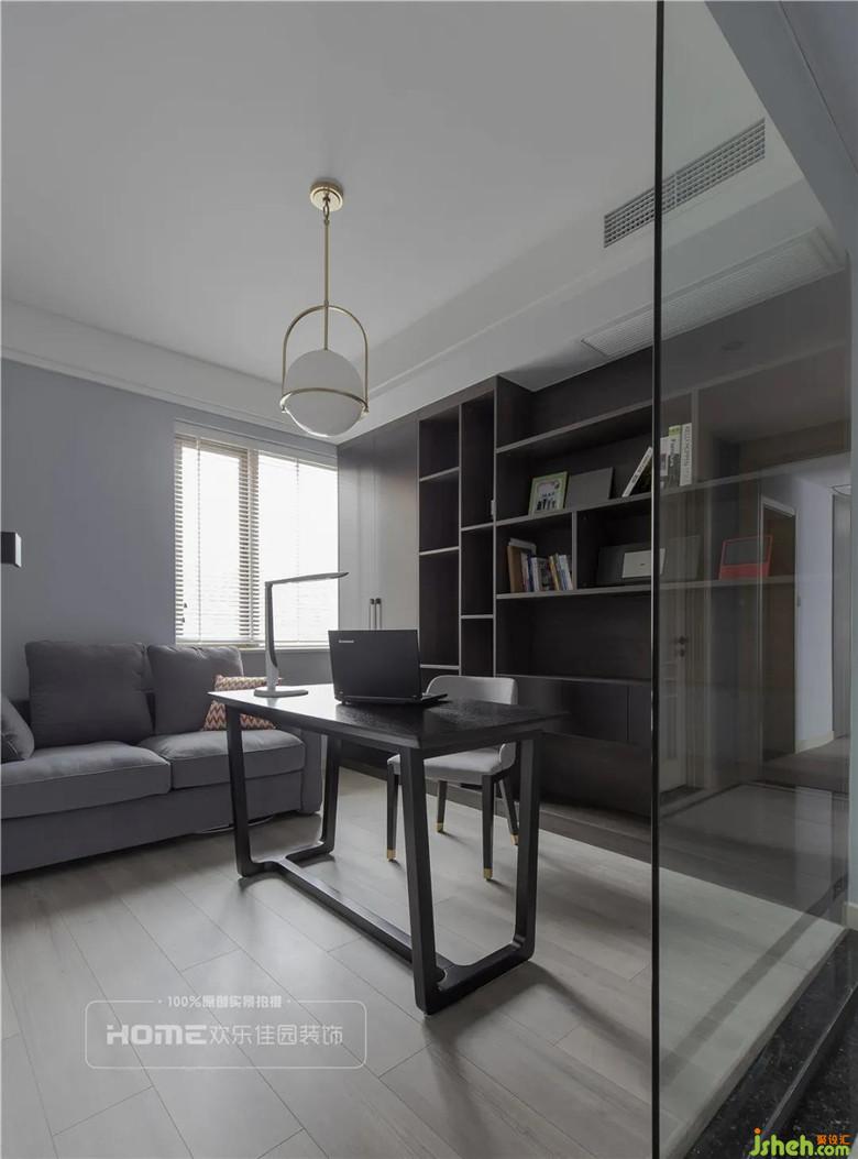 書房的設(shè)計一覽無余、不加修飾,看似空間的分離,卻又更為緊密的連在一起,使生活形態(tài)尤為具體、多變。玻璃材質(zhì)的觸感、整體色彩的和諧、軟裝陳設(shè)的考慮,帶給我們居住者的是更深的生活溫度。