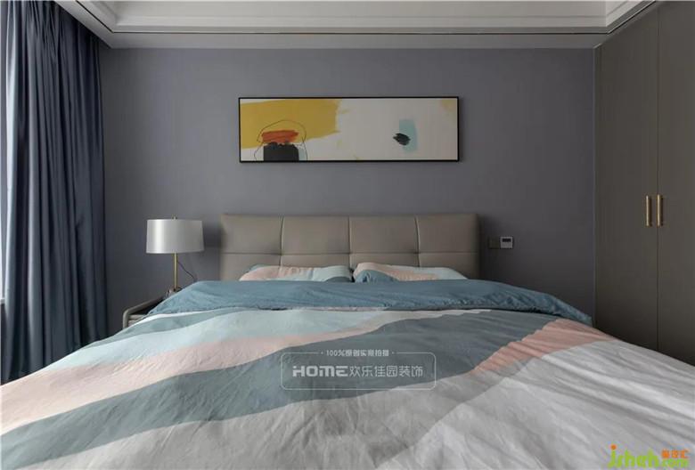 主臥的軟飾和配色趨向于閑適與放松,低飽和度的中性灰,簡單的幾何圖形和抽象掛畫作為裝飾,符合當下簡約而不失品味的生活追求,呈現(xiàn)一派舒適悠閑的生活景象。