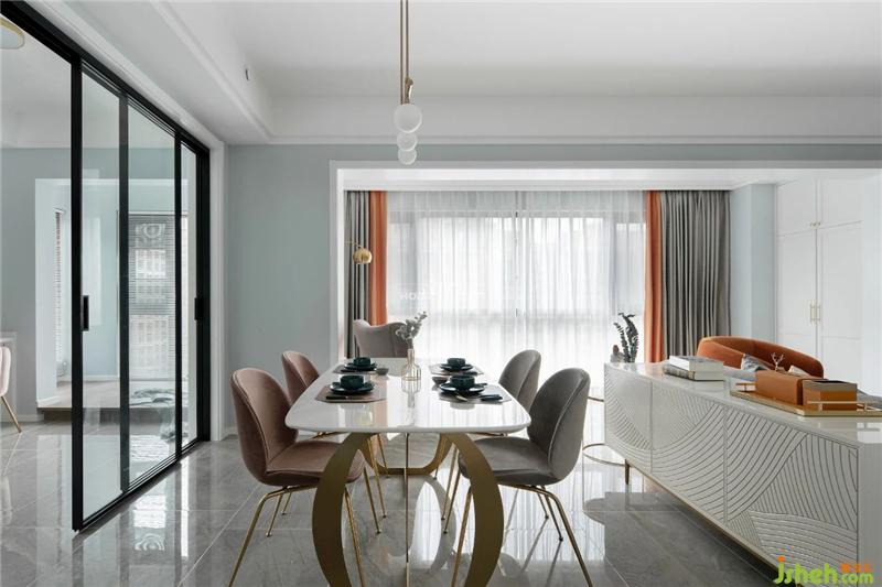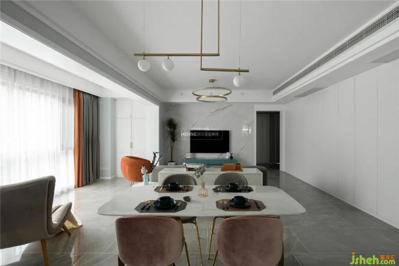 由于房屋為四室兩廳雙衛(wèi),整個空間結構中動靜分區(qū)合理,陽臺比較大,朝東光線好。設計師在寬尺橫廳的空間中沿過道墻面結合入戶空間形成L型的儲物柜位置,既增加室內的儲物空間,也讓空間的整體性更好,也進一步解決了電梯間的噪音問題。