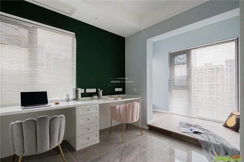 雙人書桌前墻面采用綠色墻面,既能緩解工作學習時候的視覺疲勞,也讓空間色彩層次更豐富。