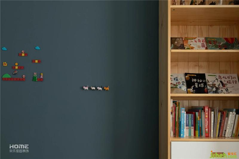 兒童房采用成品家具做空間布局,已于根據孩子年齡以及空間需求更換空間布局,在房間內家居設計墻面采用磁性漆加黑板漆的方式,給孩子一個獨立且自由的空間。
