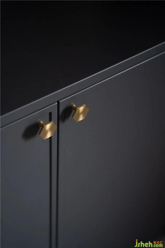 餐廳和客廳的分割帶有一個(gè)收納性極強(qiáng)的樓道空間,可以收納一些大物件,比如高腳風(fēng)扇、業(yè)主的樂器等。裝修設(shè)計(jì)儲物空間的櫥柜門采用的是藍(lán)灰色柜門搭配金色質(zhì)感的拉手,與空間的整體色調(diào)融合為一體。