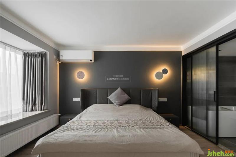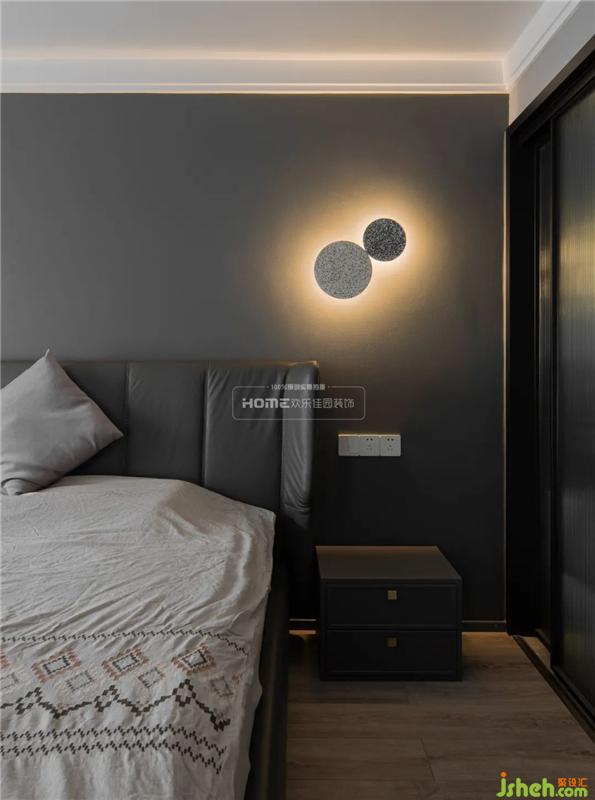 主臥室床頭采用深灰藍(lán)色黑板漆,床頭燈采用壁燈的形式讓房間燈光更加有層次。