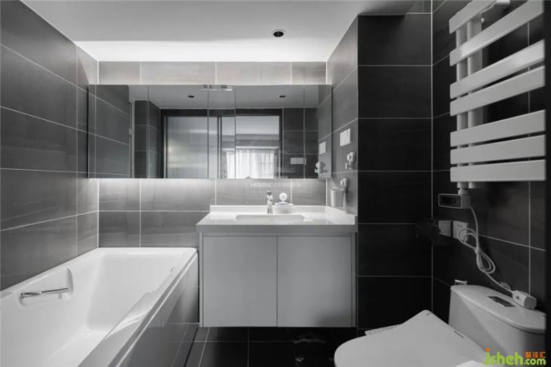 主衛(wèi)生間門采用大長(zhǎng)虹玻璃雙推門,將衛(wèi)生間空間與主臥室形成整體空間,鏡柜裝修設(shè)計(jì)師采用空間整體拉通的布局,并在鏡柜后采用上下隱藏?zé)魩В庠慈岷?,也可擴(kuò)大視覺(jué)空間。