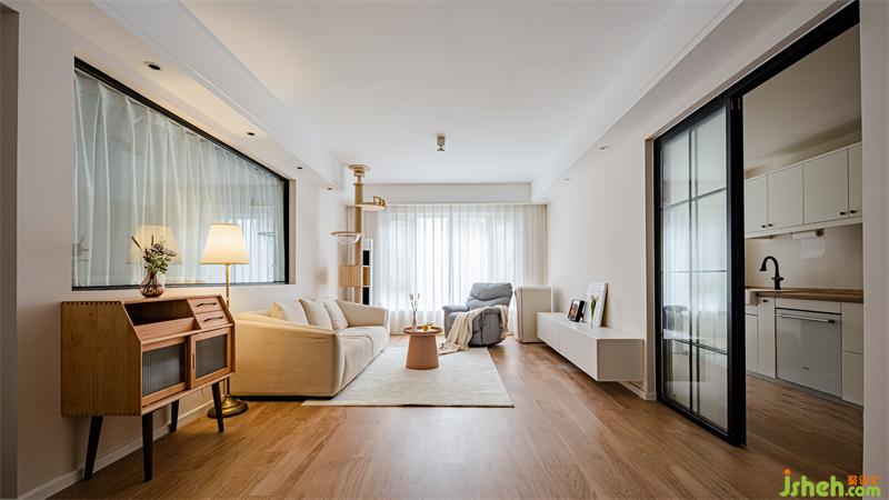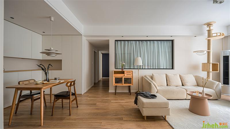 客廳整體色調(diào)采用奶白色搭配原木,營(yíng)造出清新的空間感。原木貓架的設(shè)計(jì),不僅讓貓咪有了嬉戲玩耍的地方,也讓整體空間延伸,增強(qiáng)視覺感。摒棄過度的華麗裝飾,簡(jiǎn)潔的線條,溫和的色調(diào),安寧地詮釋出靜謐的格調(diào)。