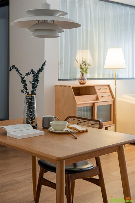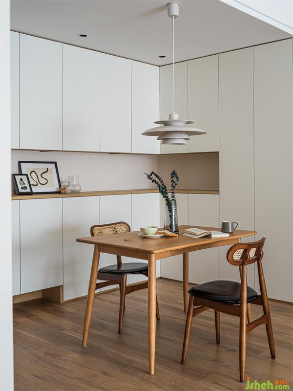 將入戶儲(chǔ)物柜以及餐邊柜整體處理,增加空間整體性。原木餐座椅與原木零食柜相呼應(yīng),白色系的主色調(diào)讓空間中的不同元素可以彼此連貫,材質(zhì)、色系之間對(duì)應(yīng),釋放家中的穩(wěn)重恬靜與平和。在這里就餐食欲一定會(huì)倍增!