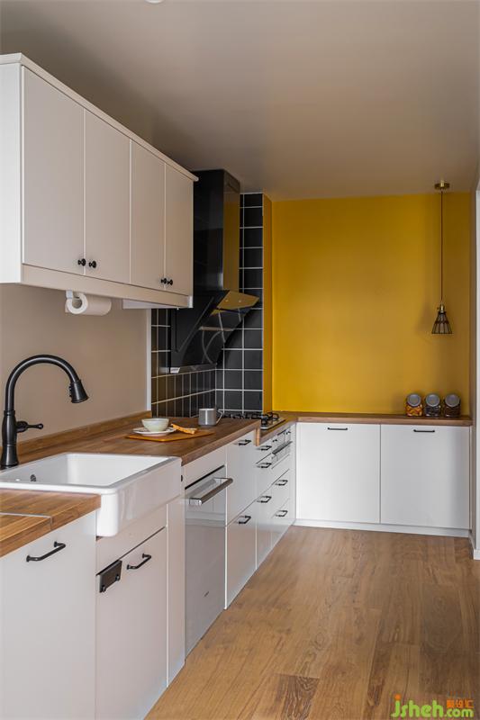 根據(jù)業(yè)主的烹飪習(xí)慣,在成都家居設(shè)計(jì)中摒棄傳統(tǒng)門檻石以及瓷磚,將客廳地板延續(xù)到廚房位置,使空間更簡(jiǎn)潔,整體性也更強(qiáng)。并在墻面采用專用防水漆,增加空間色彩層次。