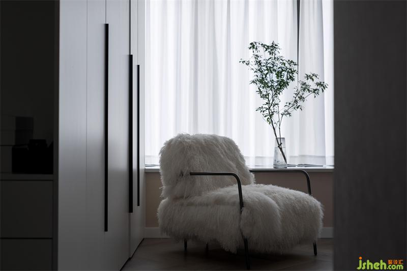將原有衛(wèi)生間占比調(diào)小,滿足女業(yè)主獨(dú)立衣帽間的需求;用嵌入式衣柜作為獨(dú)立衣帽間的隔墻,增大空間儲(chǔ)物而又減少墻體阻隔。床頭造型利用干凈利落的線條和窗外靈動(dòng)綠植形成高反差,塑造強(qiáng)烈的視覺沖擊力,跳色的床體顏色淺淺的點(diǎn)綴頗有一種純粹而寂靜的空靈之美;身居其中緩解一天下來工作與家庭帶來的疲倦感,讓生活成為品質(zhì)的外延。