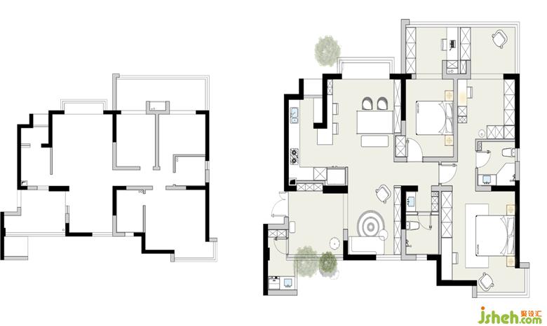 原戶型不足:餐廳和廚房較小,廚房采光差,生活陽臺小,主臥室收納空間少。
