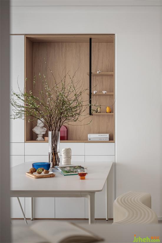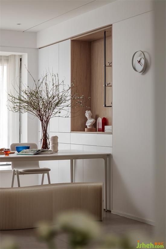 由于業(yè)主不太喜歡朋友到家里來,日常聚會幾乎都在外面。那么本案該重新定義客廳。我們放棄傳統(tǒng)的客廳布局,用多功能餐桌為中心,把原客廳打造成集閱讀.會客.辦公.用餐為一體的多功能空間。家裝設計利用吧臺劃分廚房跟原客廳空間。整面墻的收納我們選擇開放式與封閉式柜體結合讓空間增添趣味性。