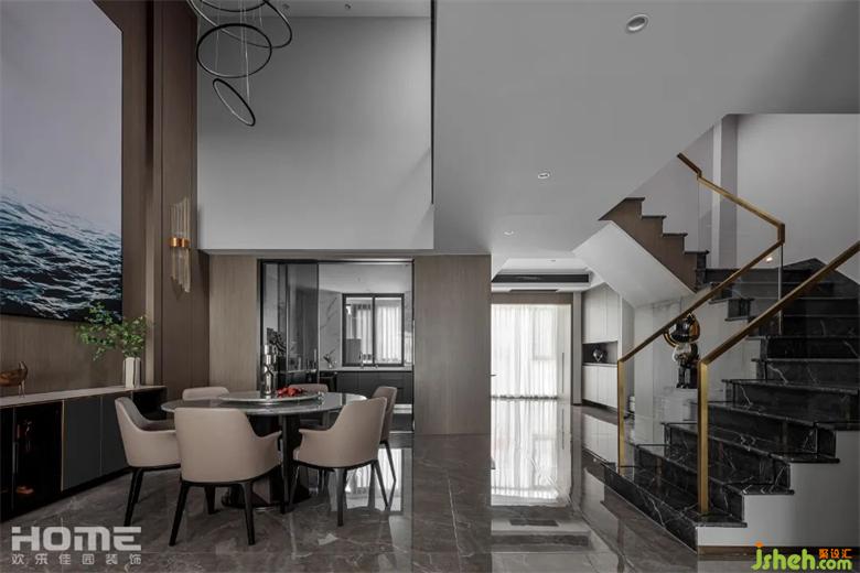 餐廳保留原有的挑高空間,增加視線感和空間感。別墅設(shè)計(jì)“空”出的餐廚廳空間呈開(kāi)放式布局。與客廳形成連貫的洄游動(dòng)線,讓家人有更多共處的時(shí)間。