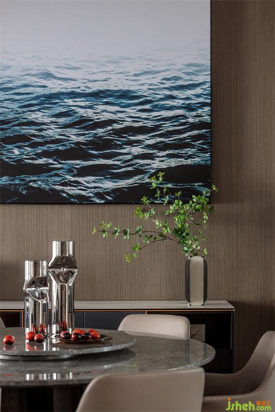 將近6米的挑高空間,量身定做的巨幅裝飾畫(huà),畫(huà)上方大量留白,與整體深色空間相呼應(yīng)。