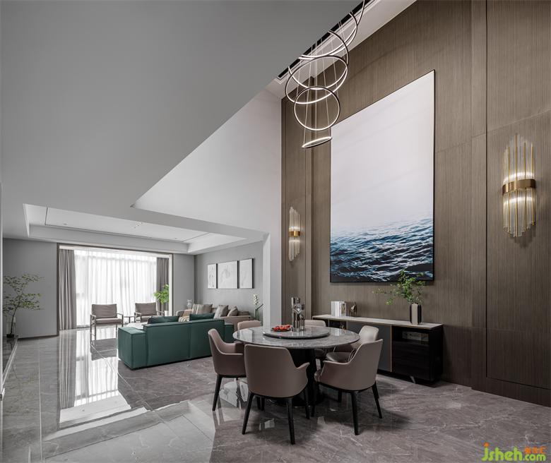 客餐廳一體化,視野更加寬敞明亮,別墅設(shè)計(jì)整個(gè)客廳的動(dòng)線、視線重心都被解放。