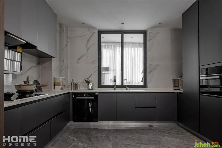 為滿足業(yè)主需求,將原有廚房擴(kuò)展到餐廳,增加廚房面積。別墅設(shè)計(jì)廚房與餐廳連貫,增強(qiáng)空間的延伸感!