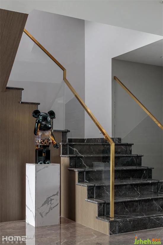 本案空間整體以高級灰為主基調來打底,不同的金屬材質與藝術漆貫穿空間各角落。別墅設計脫離一切浮華和不實用,從生活的本質和業(yè)主的生活習性出發(fā)以極簡的設計演繹最本質的意式輕奢美學!
