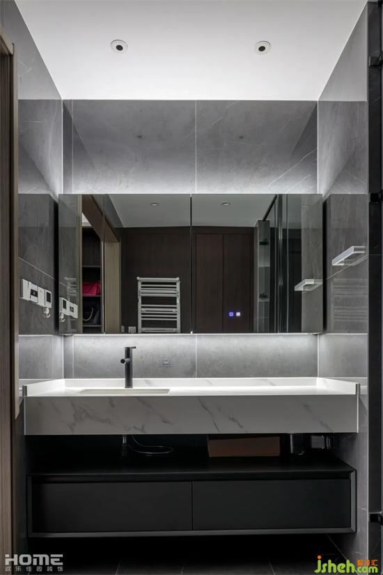 衛(wèi)生間與衣帽間相連通,增加空間的延伸感。http://m.domain-2.com/plus/list.php?channelid=18&tid=80&jiazhuang=3000&nativeplace=0洗漱臺用鏡子拉通,后面為儲物空間,滿足日常需求的同時又增強空間畫面。