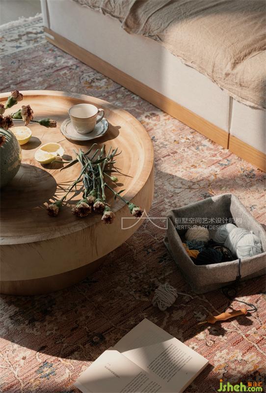 陽光透過紗幔灑向室內(nèi),為生活留下自在隨性的痕跡。干凈柔和的墻面,紋理隨意的實(shí)木家具,麻布呈現(xiàn)出自然的褶皺,讀到一半的書,放在地毯上的織物,和還未插完的鮮花...