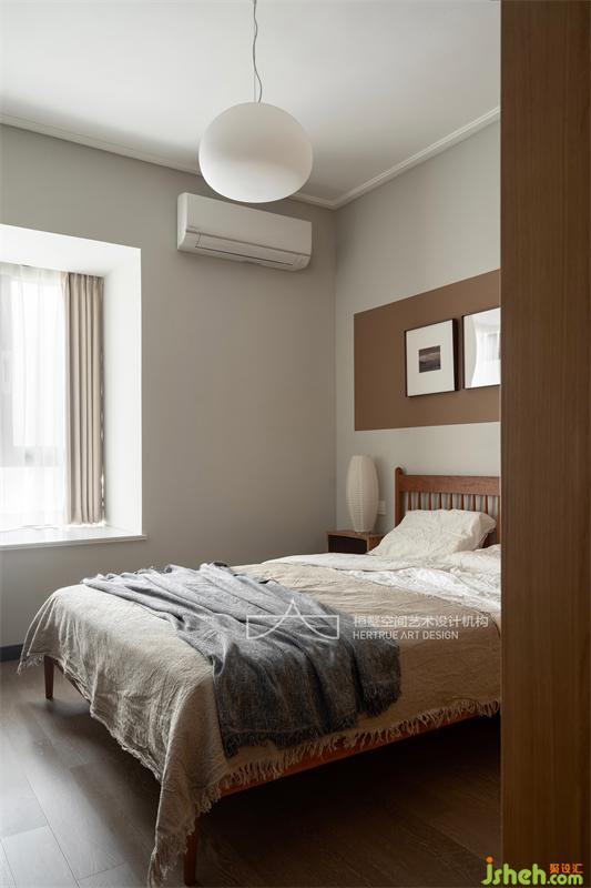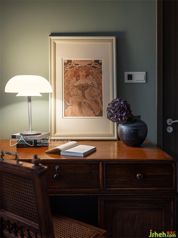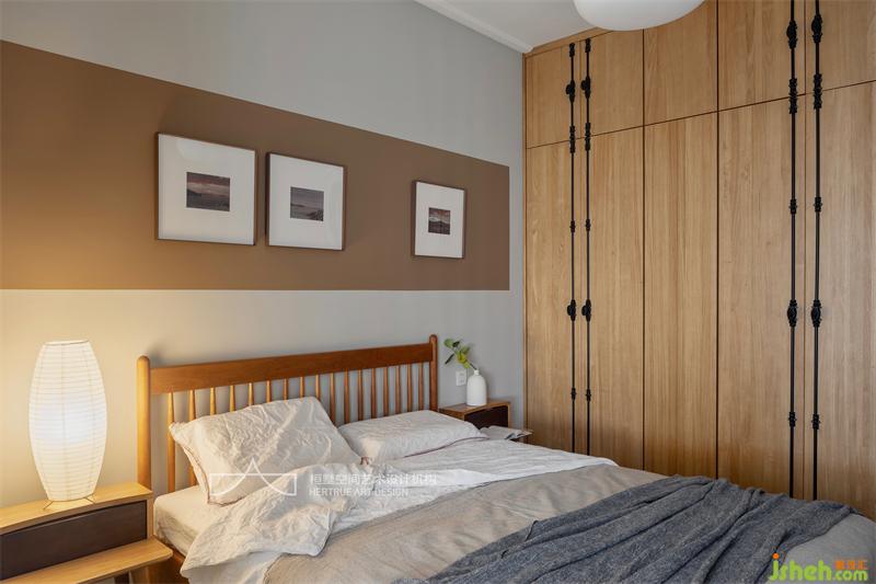 依舊是純粹的自然元素,裝飾畫刻意留白,宣紙臺(tái)燈的光線柔美而溫馨,天地鎖和實(shí)木衣柜的匹配,增添了一絲復(fù)古感。
