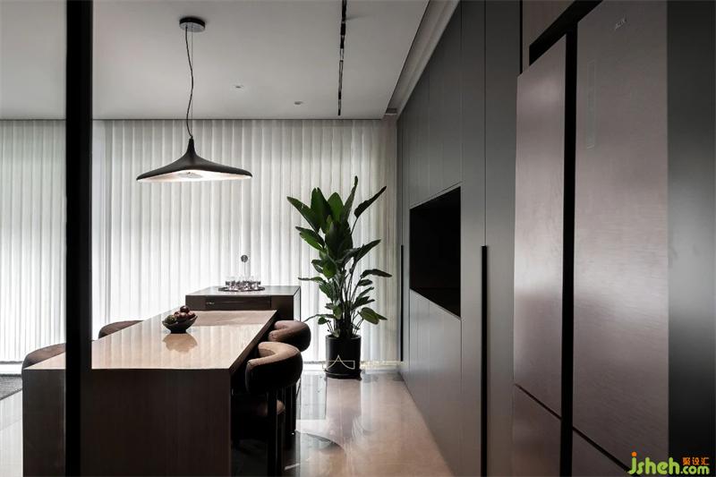 而餐廳是家中最具溫度和味覺記憶的空間,重慶裝修設(shè)計(jì)師以簡約實(shí)用的筆觸描繪這片美學(xué)場域。特意選用棕色餐桌椅平衡空間的冷冽感,另設(shè)一處中島增加空間互動(dòng)與實(shí)用性,內(nèi)斂深沉的收納展示柜滿足日常需求;個(gè)性獨(dú)特的吊燈靜靜垂落,暈白的燈光溫柔而高級,緩緩照亮家人間的溫情時(shí)刻。