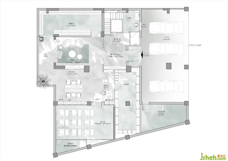 負(fù)樓層退合適距離為車庫入戶留出外前廳,整理過渡再入室內(nèi);解構(gòu)負(fù)二負(fù)一層功能動線,調(diào)整樓梯位置于一處貫穿上下,設(shè)置電梯位置,挑空入戶玄關(guān)、合理規(guī)劃天井借光,將需要安靜的茶室、收藏間、家庭影院置于負(fù)二層;成就入戶高挑空玄關(guān)以及茶室,于青磚竹韻里一室干凈明。