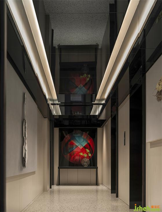 進(jìn)入從規(guī)范的現(xiàn)代主義電梯廳進(jìn)入,大紅色玄關(guān)柜搭配藝術(shù)畫作瞬間點(diǎn)亮眼前的空間,轉(zhuǎn)角墻面懸掛葉方的《虛實(shí)之間》,藝術(shù)品對情緒完成了一次微小而精妙的撞擊,它意味著你已步入全新的世界。