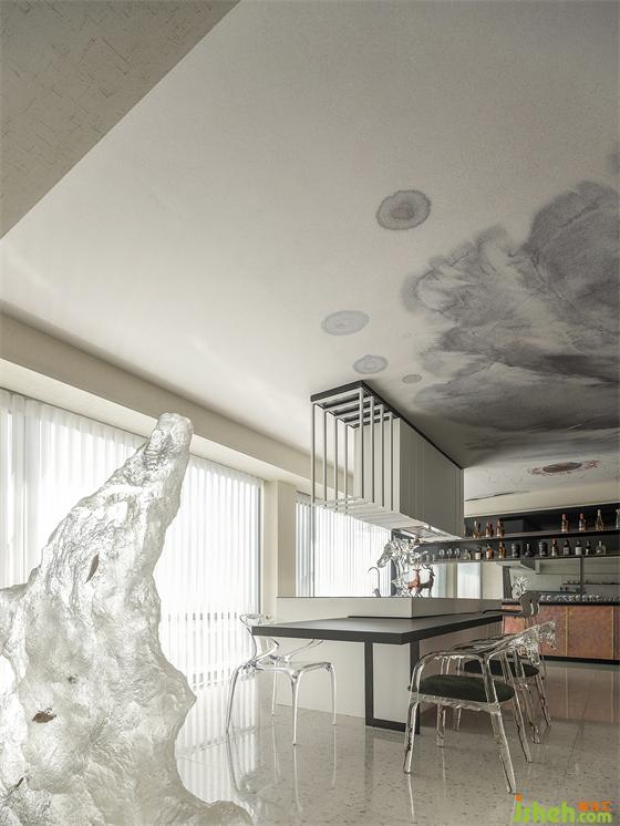 厚重的柜體與餐椅冰川滴落般的設(shè)計(jì)再次釋放剛?cè)岵?jì)的反差魅力。大平層私宅裝修設(shè)計(jì)隱于中島后的櫥柜面板材質(zhì)在不同視角下呈現(xiàn)由綠到紅的過度,與天花上轉(zhuǎn)印的巨幅睡蓮形成倒置的奇妙互看,整個(gè)區(qū)域似乎蕩漾與藝術(shù)與現(xiàn)實(shí)交融的湖面,古典與當(dāng)代交融。