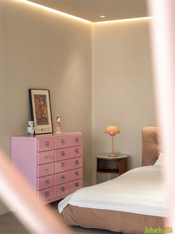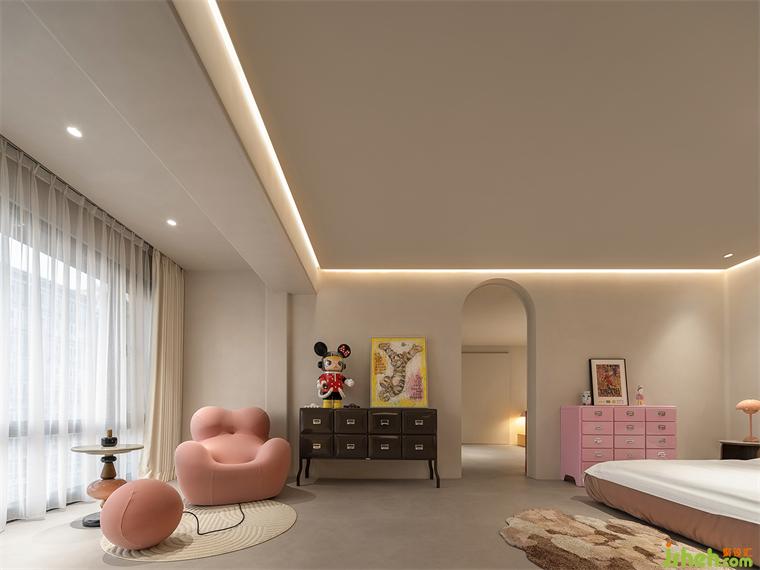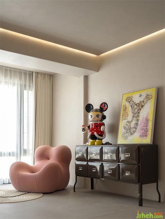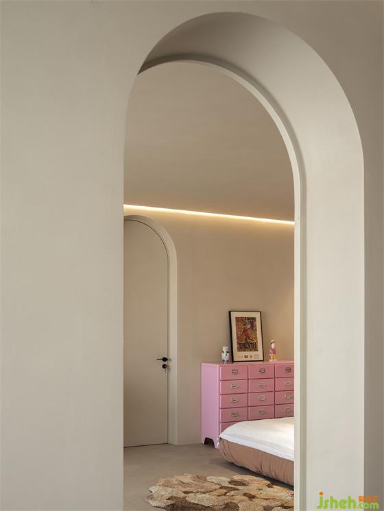 大平層私宅裝修設(shè)計(jì)拱形和柔軟的弧線由結(jié)構(gòu)延續(xù)到家具和配飾,糖果一般的甜蜜氛圍在亞麻色的基底上并不顯得唐突,反而調(diào)和了公共區(qū)紛繁層疊的細(xì)部,情緒在這里歸于和緩。
