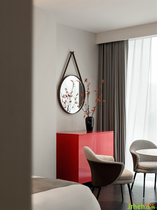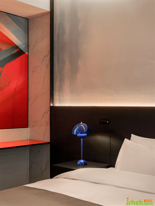 餐廳內(nèi)放置了水藍(lán)色的玻尿酸主題藝術(shù)畫,精品酒店設(shè)計為空間注入了層次之美,紅色、灰色座椅與水磨石桌面重疊交錯,輝映著光線的維度。若隱若現(xiàn)的窗外景色,為用餐空間帶來斷續(xù)的節(jié)律感。