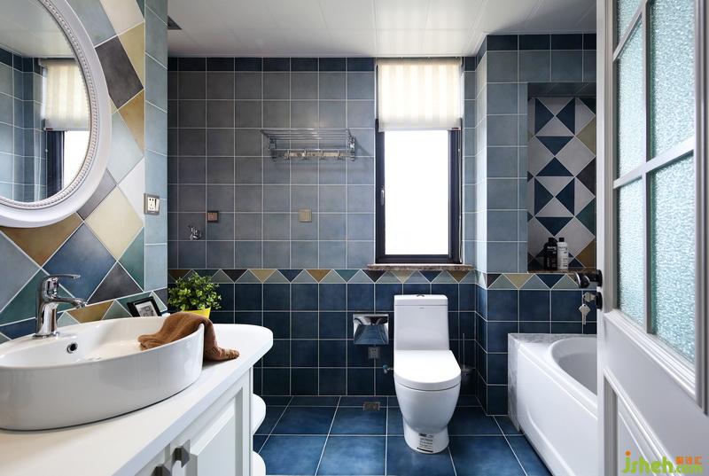 衛(wèi)生間的瓷磚室內(nèi)設(shè)計(jì)師整體選用藍(lán)色系,衛(wèi)浴產(chǎn)品選用白色亮面,活躍整體空間;我們室內(nèi)設(shè)計(jì)師將一片方形瓷磚對(duì)角線切開(kāi)成三角線,拼貼出腰線效果和背景圖案,即豐富了空間層次,同時(shí)也節(jié)約造價(jià)。