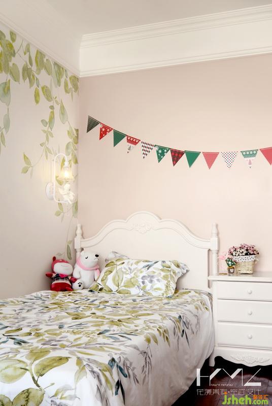 主臥碎花壁紙營造浪漫的鄉(xiāng)村度假氣息,原木色地板讓空間典雅沉靜,綠色的抱枕和紡織床品帶來清風般的清爽,自然而然讓居室洋溢著淡淡的文藝氣息。