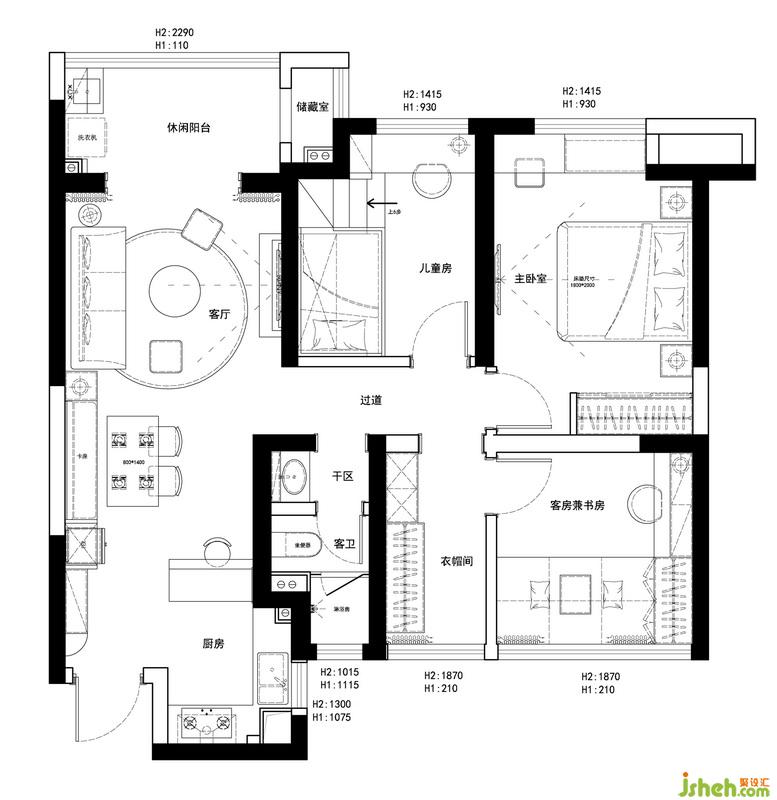平面布置中,設(shè)計(jì)公司將廚房改成開放空間,進(jìn)門收納柜與餐廳卡座做成整體結(jié)合,將生活陽臺與客廳融為一體,從而擴(kuò)展了客廳整體視野面積,將晾曬功能內(nèi)置,用烘干機(jī)替代,依然保留三個房間和一個衣帽間的格局,將房子使用面積實(shí)現(xiàn)最大化。