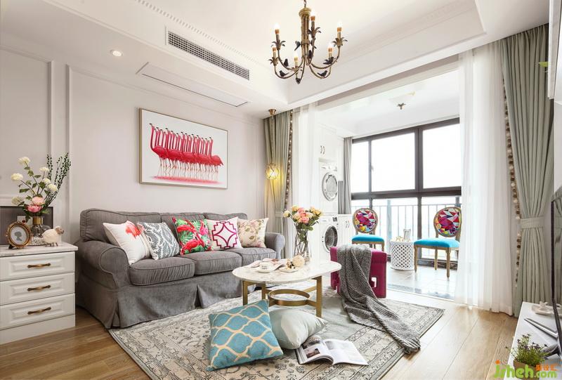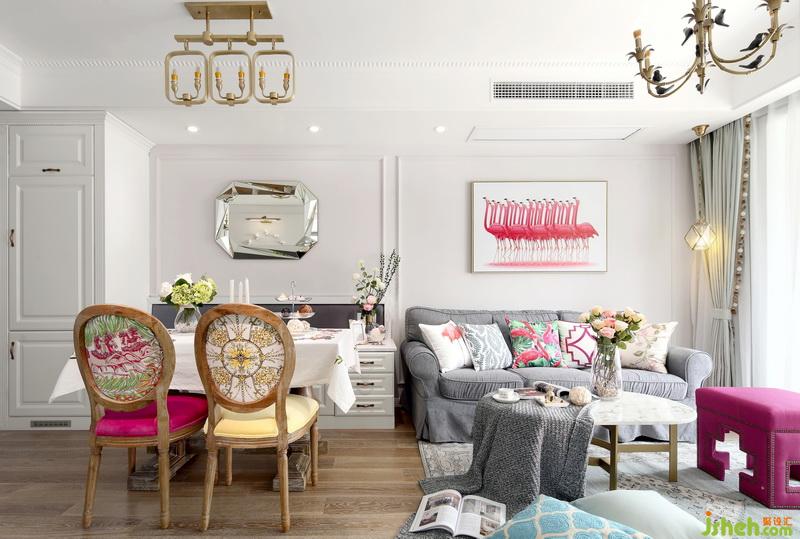 風(fēng)格與色彩定位在起初溝通階段本是溫暖的輕美式,設(shè)計(jì)初始,設(shè)計(jì)公司被一張色彩鮮艷的玫紅色調(diào)的火烈鳥掛畫所吸引,以畫為出發(fā)點(diǎn),顏色上更是大膽運(yùn)用了翠綠、淡藍(lán)、明黃等比較跳躍的色彩與玫紅搭配,加之灰度色過度,使整個空間呈現(xiàn)一種暖人心配的定調(diào)。