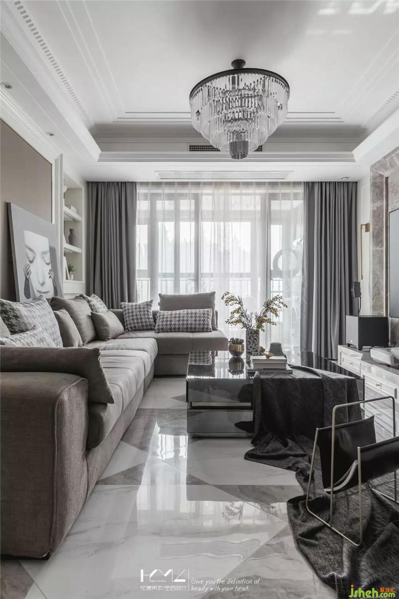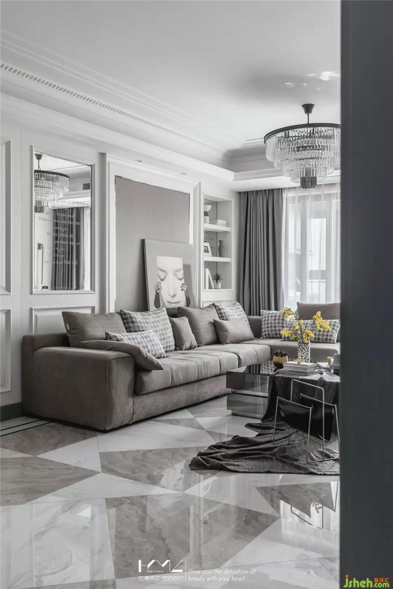 客廳地面地磚,選用了兩種顏色紋理進(jìn)行拼接鋪設(shè),設(shè)計(jì)了鉆石切割的鋪貼方案,高貴的材質(zhì)感,體現(xiàn)摩登時(shí)尚的生活品質(zhì),即使家居生活中不鋪地毯,也是讓人賞心悅目的。