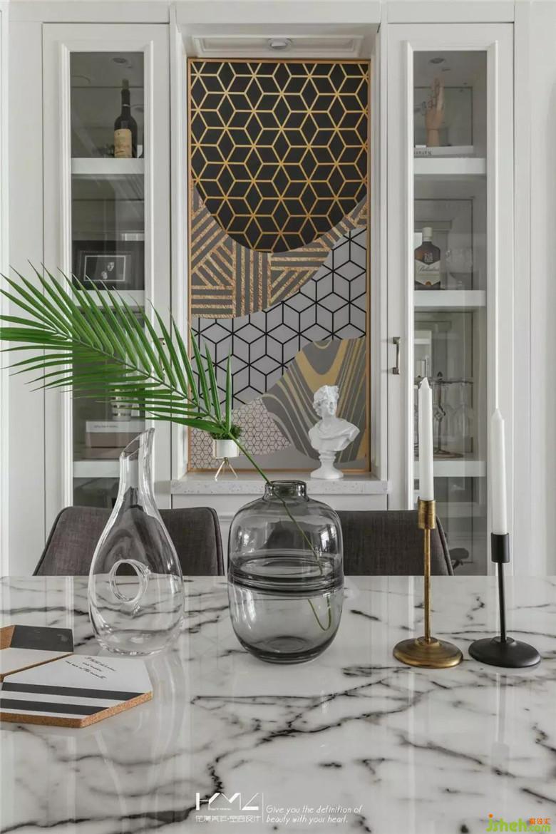 餐邊柜背景我們使用了一幅輕奢質(zhì)感的裝飾畫,色系集合整個空間的各個配色,兩側(cè)設(shè)計了展示櫥柜,業(yè)主收藏的紅酒可以在酒柜中開放展示,實用美觀。