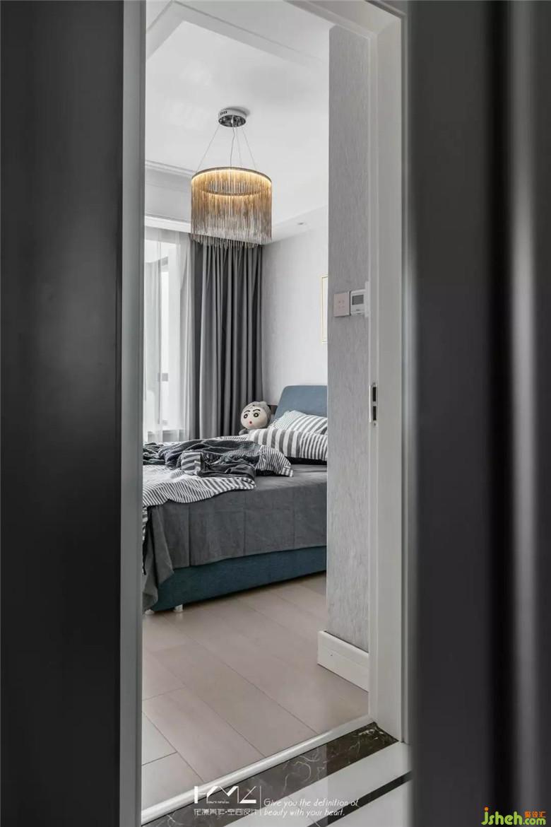 主臥的設(shè)計,延續(xù)了客餐廳簡約的層次和色調(diào),吊頂豐富而精致,與墻面簡歐護墻互相呼應(yīng),提升了空間的整體飽滿度,融合了高級灰的質(zhì)感,水晶與金屬材質(zhì)搭配的吊燈,繁復(fù)而又精致。