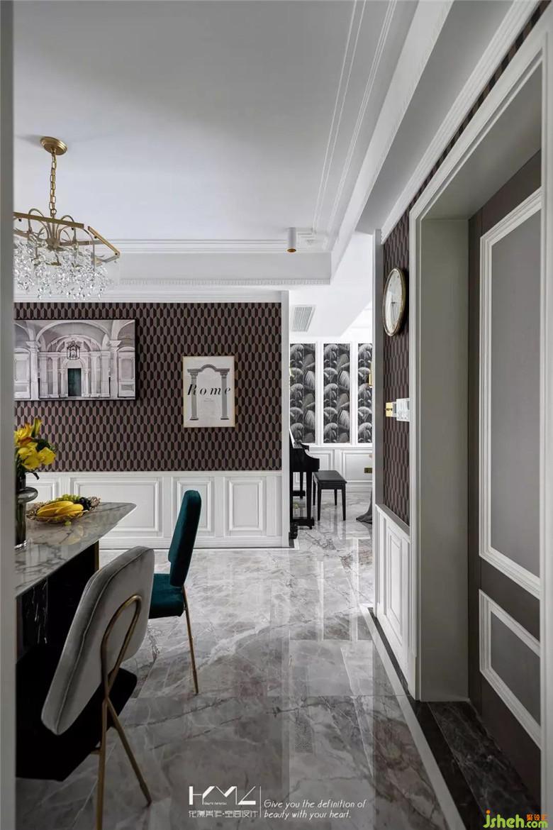 餐廳是整屋的中廳,整體想營造古典輕奢復(fù)古風(fēng),在主背景上,運(yùn)用帽頭,上下護(hù)墻分割,雕花,對稱黑金壁燈,金色框裝飾鏡這些元素揉搓融合,再結(jié)合水晶吊燈,石膏美式線條等一系列經(jīng)典美式元素,框出餐廳唯美動(dòng)人的輕奢風(fēng)采。