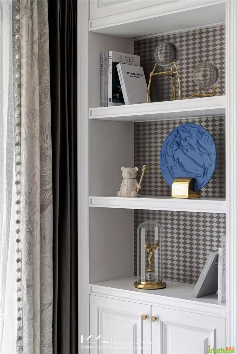 左邊是復(fù)古造型的金色邊幾,平衡呼應(yīng),編織款式的長條落地榻凳選用深灰絨,結(jié)合地面三角幾何拼接的地毯紋理,無一細(xì)節(jié)不體現(xiàn)美式與現(xiàn)代、繁復(fù)與簡約的彼此融合。