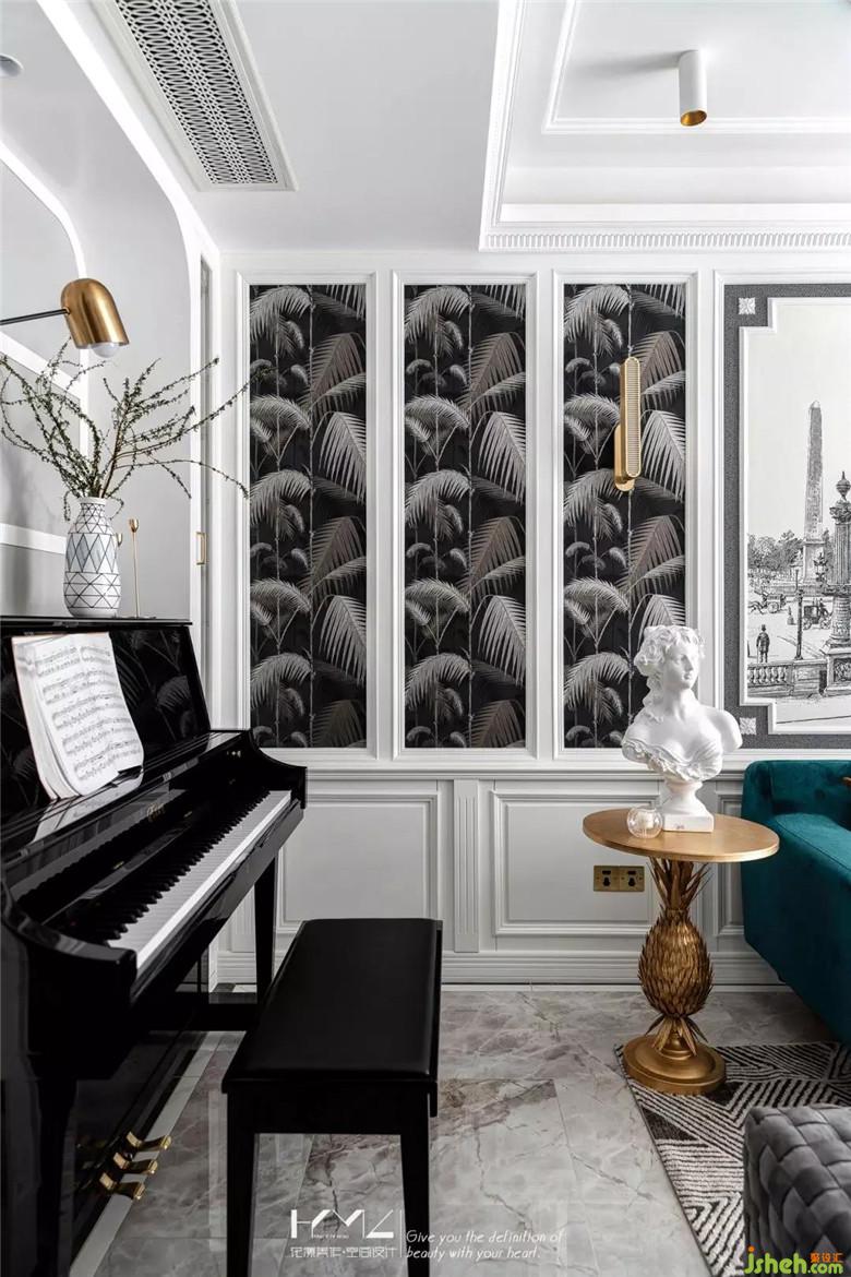 兩邊壁紙是英國cole&son的棕櫚葉系列,型號是95-1004,中間背景畫是一副名為《雕像》的壁畫,古老建筑物中風(fēng)雨侵蝕的雕像,意在傳遞一種永恒的精神,這也符合一個家的精神追求;流蘇水晶燈與頂面層次疊起的石膏線條豐富空間細(xì)膩層次,在主體家具的選型上,偏向現(xiàn)代風(fēng)格,意在詮釋混搭的意義,同時呈現(xiàn)中西合璧的折中主義精神。