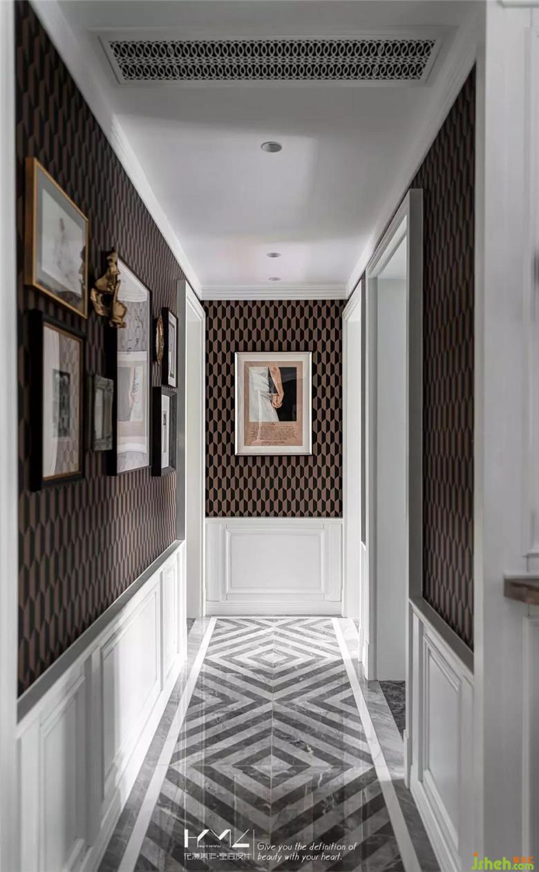過道下墻裙白色護墻板從客廳從餐廳延伸過來,上部分是英國cole&son的幾何系列壁紙,地面拼花迎合了門廳的拼貼,運用雙色菱形的延伸,讓空間擴容。
