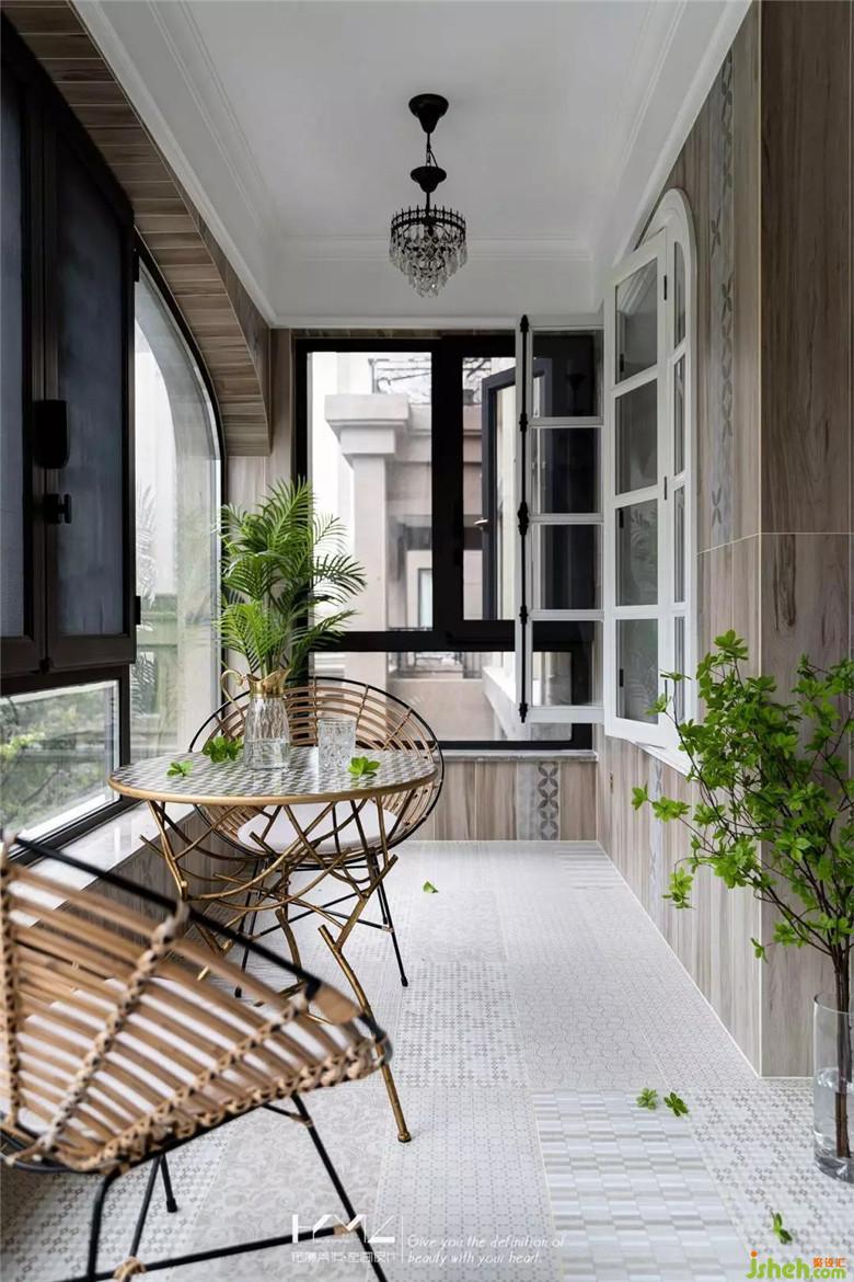 一組藤編休閑座椅加藝術(shù)腿的茶幾,組合自然舒適,耐得住陽光的暴曬,又很輕便,可以根據(jù)需求,移動到陽臺的不同位置。復(fù)古的水晶吊頂精致美好,兩處角落都擺放了室內(nèi)綠植,增添綠意。