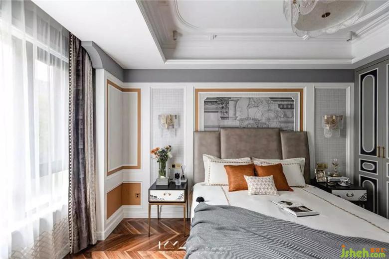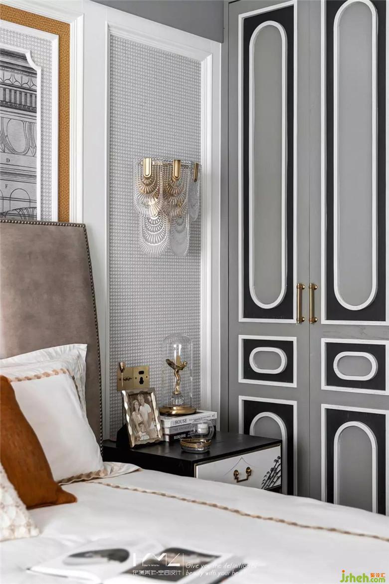 皮革鉚釘?shù)母弑炒?,尊貴而又懷抱安全感,中式復(fù)古的床頭柜打破界限的存在我們美式空間里,中西合璧貫穿始終。