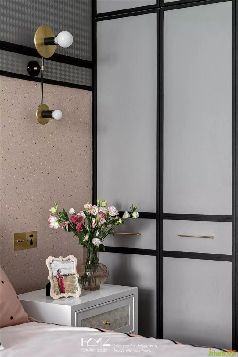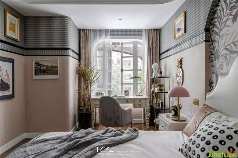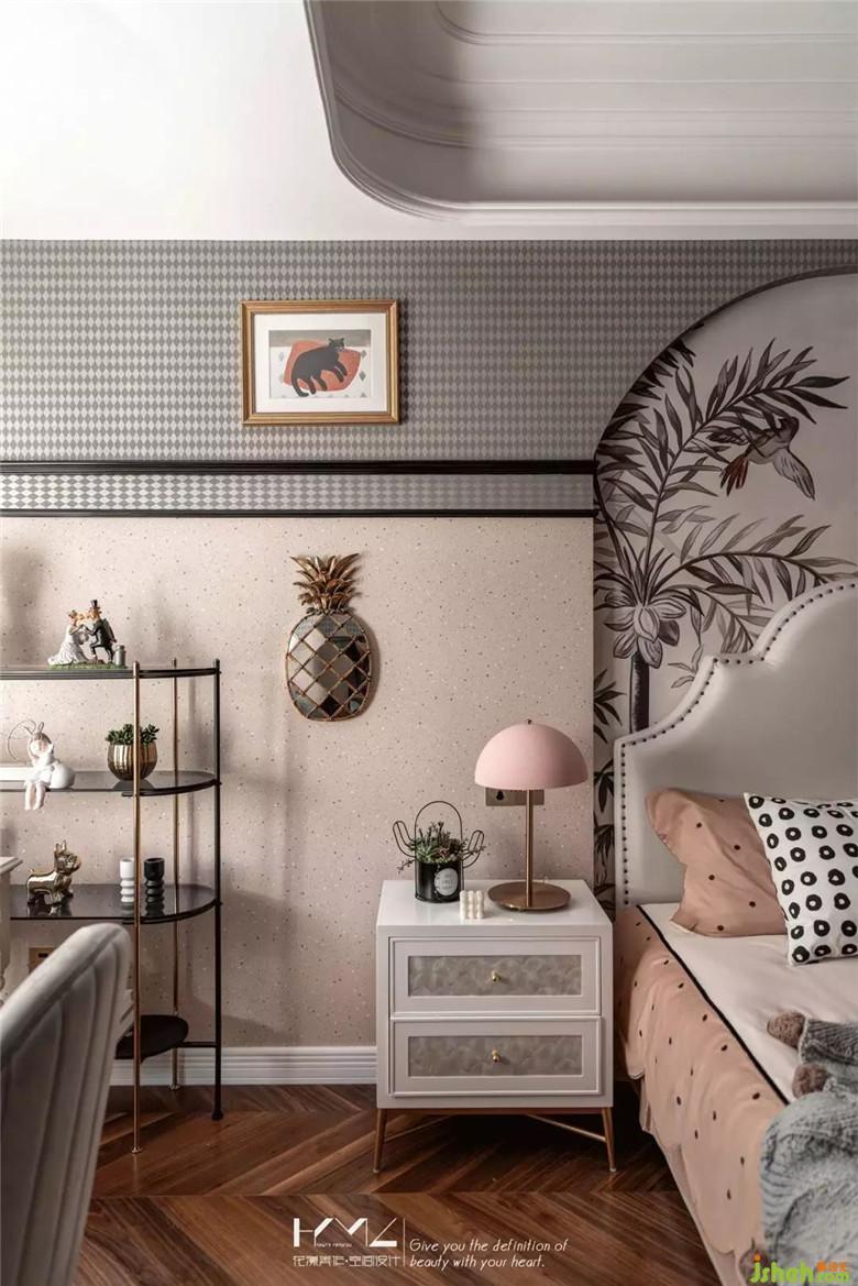 女兒房風(fēng)格定位偏向田園美式,因為女兒剛升高中,正直青春洋溢的年齡,所以裝修公司在色彩定位上以少女都喜愛的淺粉色做主色調(diào),淺灰壁紙做配色,黑框線條做點綴,整體體現(xiàn)一種輕熟少女的味道。