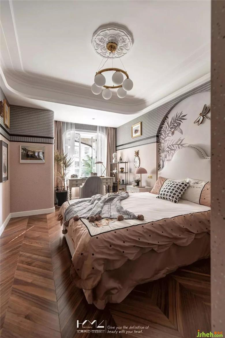 床頭柜上貝殼紋抽屜面板,精致易打理,床頭兩邊燈飾采用非對稱形式,左邊是粉色臺燈,與菠蘿鏡飾和貓咪復(fù)古裝飾畫形成一組裝飾,右邊是壁掛的黑金壁燈,與主吊燈又能呼應(yīng),左右兩邊平衡和諧。窗臺下,橡木做舊紋理寫字桌與挑時的網(wǎng)紅金屬書架高低組合,學(xué)習(xí)之余,眺望窗外的景色。