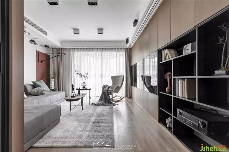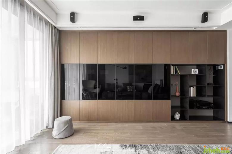 屋主一直有讀書的習(xí)慣,希望能營造家庭讀書的氛圍,而客廳是整個(gè)家最核心的區(qū)域,讀書、藏書的功能在這個(gè)區(qū)域可以發(fā)揮的淋漓盡致。投影幕布代替電視機(jī),釋放柜體空間,整排書柜既實(shí)現(xiàn)了書籍的放置,裝修公司也解決了收納的問題。書柜的木質(zhì)柜門仿照KD板的顏色和木紋做油漆門,反復(fù)調(diào)色確認(rèn),盡可能縮小色差,統(tǒng)一木色。